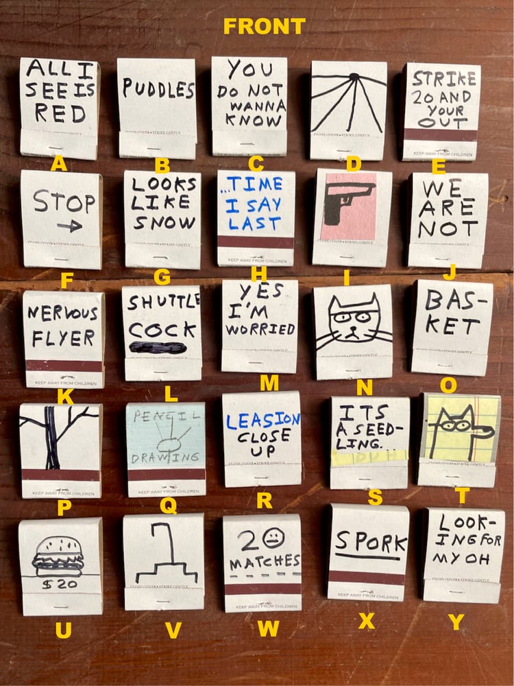 1.75" x 1.5" paper matchbooks with hand-drawn / painted designs on front & back of each. Photos show front & back design of each matchbook.